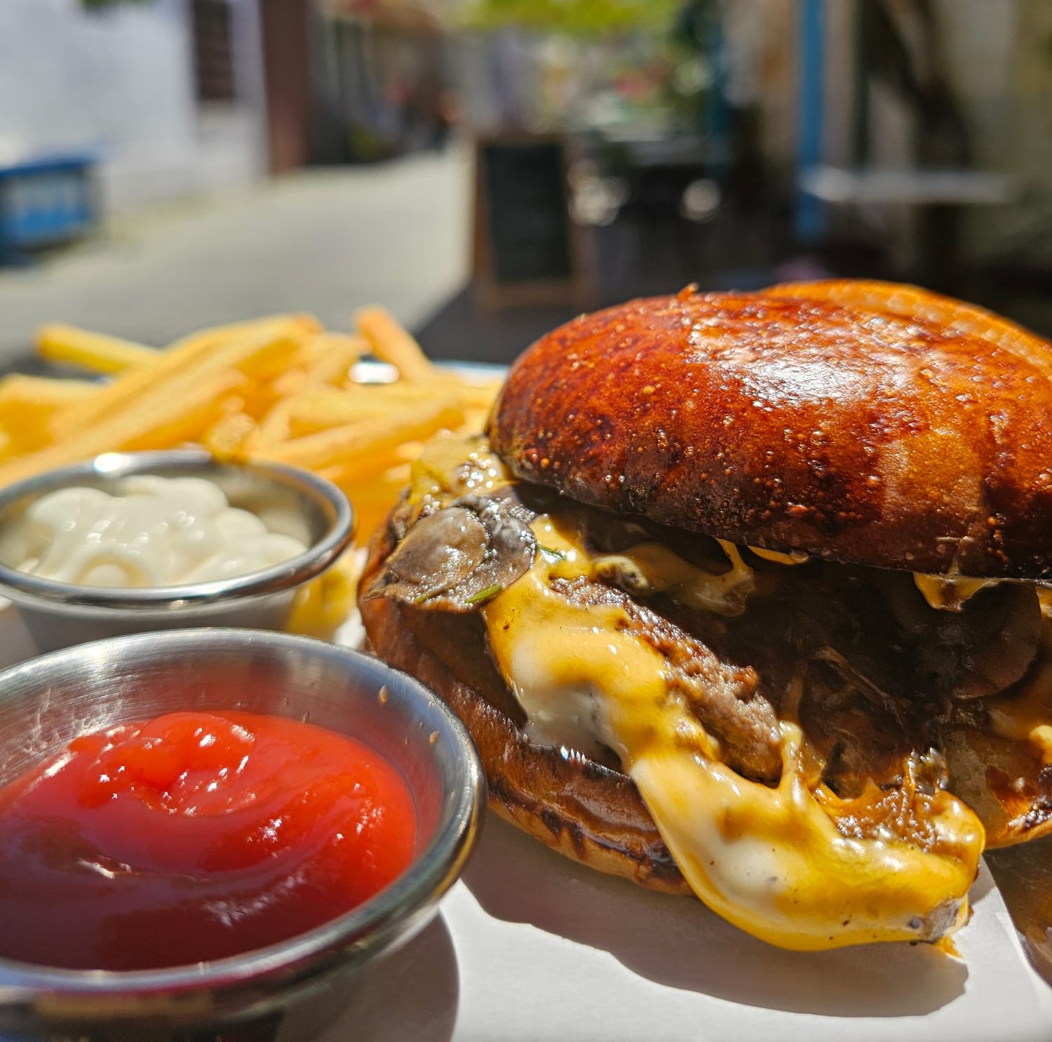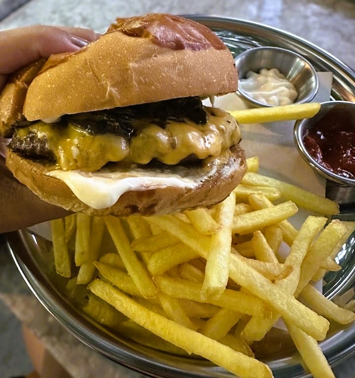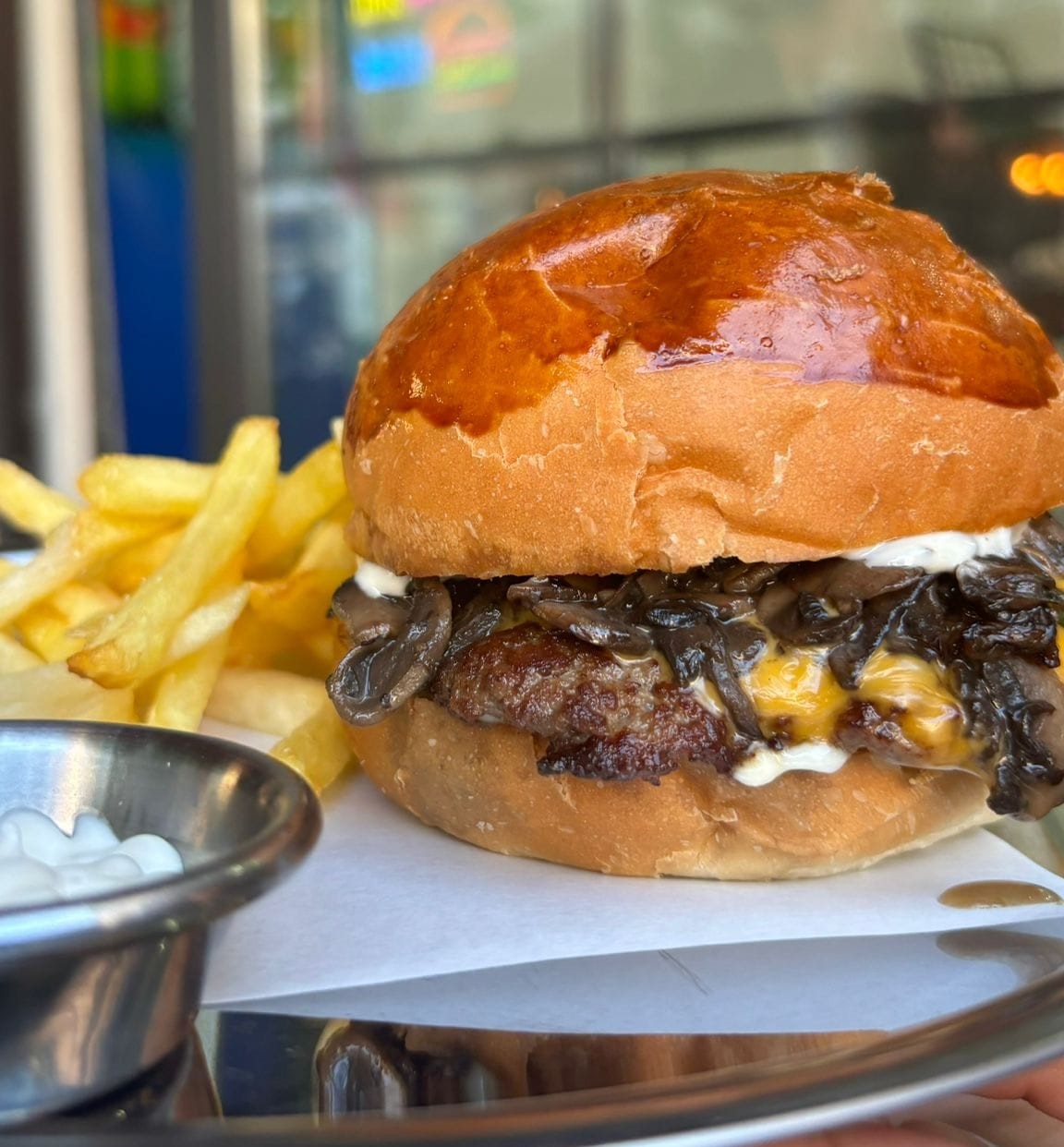 Özel Yapım Burger Ekmeği, 120 GR Burger Köftesi, Cheddar Peyniri, Karamelize Soğan, Izgara Karışık Mantarlar, Trüflü Mayonez Sos.