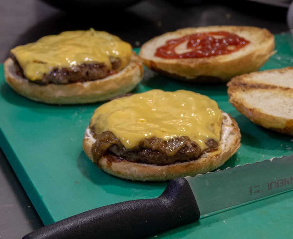 Özel Yapım Burger Ekmeği, 120 GR Burger Köftesi, Cheddar Peyniri, Karamelize Soğan, Marul Yaprakları, Tartar sos.